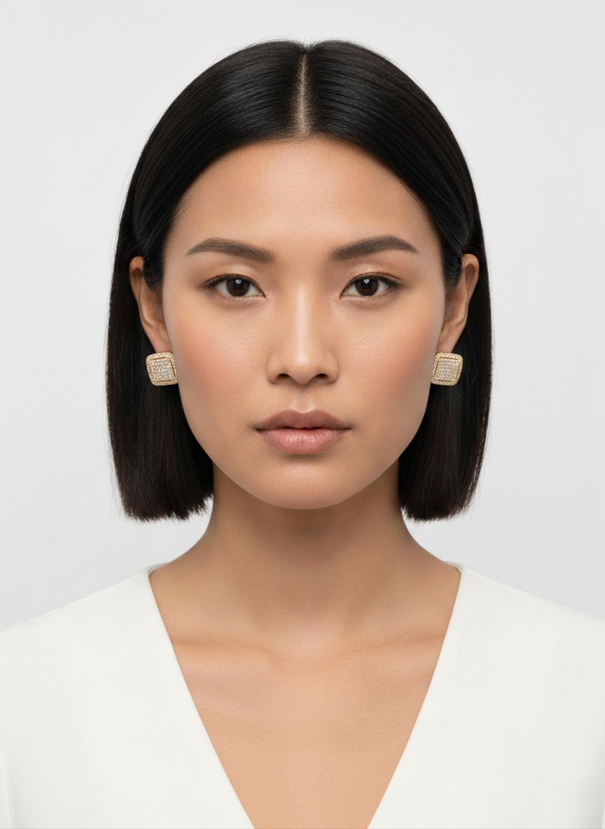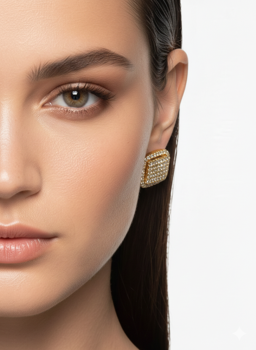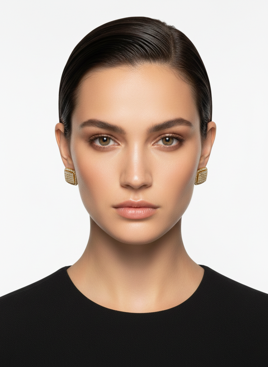 Atelier Carré Lumière Studs present a structured square silhouette framed with finely set pavé stones in a warm gold-tone finish. Designed with clean geometry and balanced brilliance, they deliver modern sophistication with understated impact. A refined essential crafted to complement both tailored daywear and elevated evening styling.