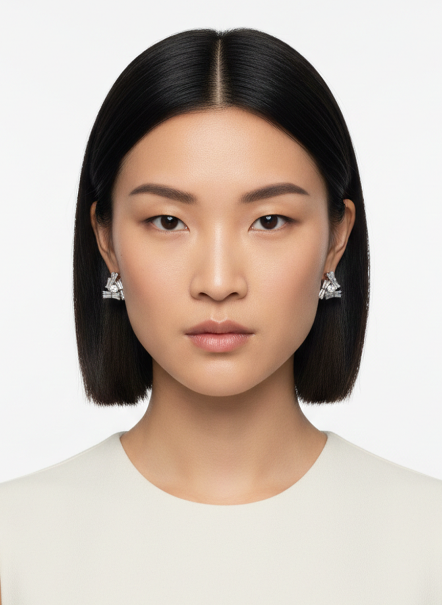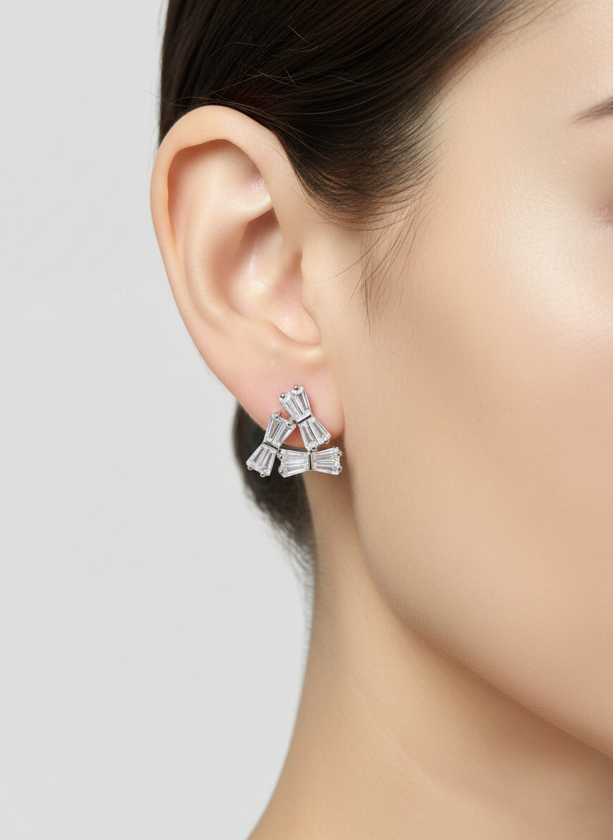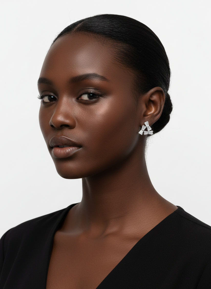 Atelier Lumière Baguette Éclat earrings showcase a sculptural arrangement of precision-cut baguette stones in a refined triangular silhouette. Designed for understated impact, their clean geometry and luminous clarity create a balanced expression of modern elegance — equally suited to tailored daywear and elevated evening moments.