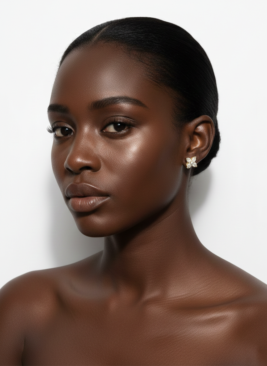 Maison Fleur Lumière Studs feature a refined four-petal silhouette formed with pear-cut stones and a luminous center accent. Set in a warm gold-tone finish, their balanced proportions and soft brilliance create understated elegance. Designed for everyday refinement, they offer a timeless expression of modern couture sophistication.